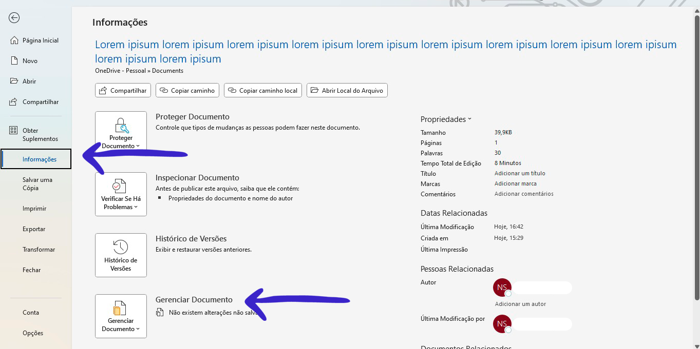 Passo 2 – Na guia “Informações”, busque pela opção “Gerenciar Documento”. Clique nela e escolha a opção “Recuperar Documentos Não Salvos”.