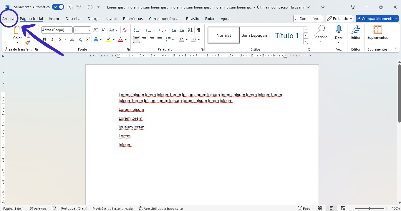 Passo 1 – Para encontrar o arquivo que foi salvo automaticamente, abra o programa e, na barra superior, clique em “Arquivo”.